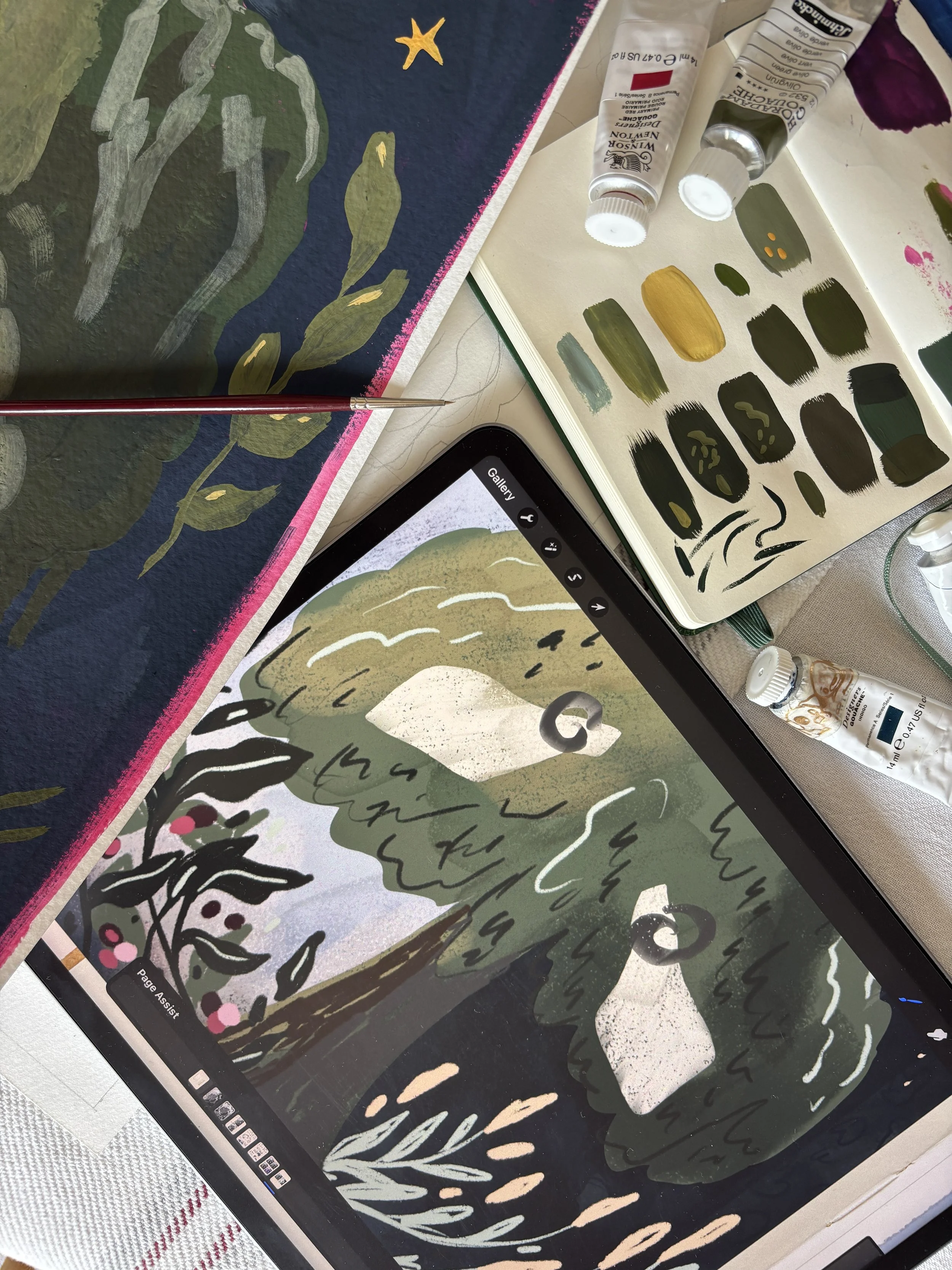 After hearing feedback, the chosen concept (or a combination of 2) gets refined and explored in more depth. I play with composition, lighting and meaningful details, developing the rough sketches for the final artwork.